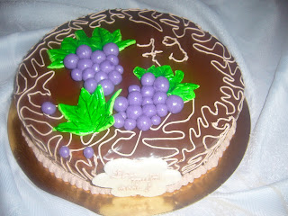 Desi nu este sezonul de struguri la cererea unei prietene am facut acest tort pentru socrul ei ... are blat pufos de cacao insiropat cu vanilie, un strat de visine cu putina zmeura si crema de ciocolata ... decorul este realizat din pasta de lapte praf ... La multi ani socrului Alina !...