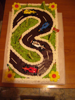 Este un tort mare,( 50 de pers ) cu blat simplu de vanilie, crema diplomat cu fructe exotice... florile sunt facute din pasta de zahar iar braduleti din ciocolata alba presarat cu nuca de cocos verde... masinutele nu sunt comestibile ( cu urmatoarea ocazie voi incerca sa fac din pasta de zahar )