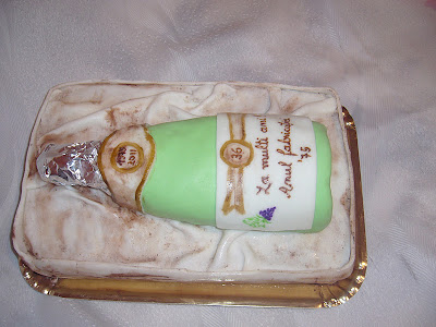 Bineinteles, l-am sarbatorit cu un gratarel si un tort facut in maaareeee graba pe care l-am terminat rapid :)... A avut blat de amandina si blat simplu de vanilie insiropat cu sirop de visine si crema ciocolata cu stafide si a doua crema de ness cu nuci pralinate. Sticla este din compozitie de, salam de biscuiti