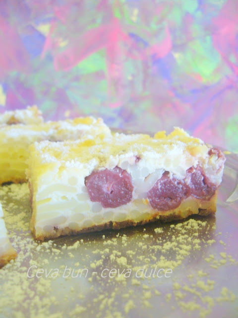 - Albusurile batute se adauga treptat la paste si se amesteca cu grija. Pe urma adaugam visinele.