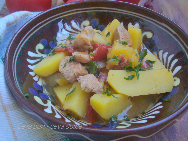 - Dupa ce aproape a fiert carnea, adaugam cartofii, ardeiul si mai completam cu apa fierbinte ca sa acopere cartofii. Adaugam bulionul si chimenul, se lasa pana ce au fiert cartofii. Daca e nevoie de apa se completeaza cu apa fierbinte.