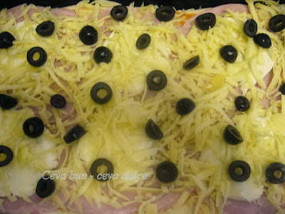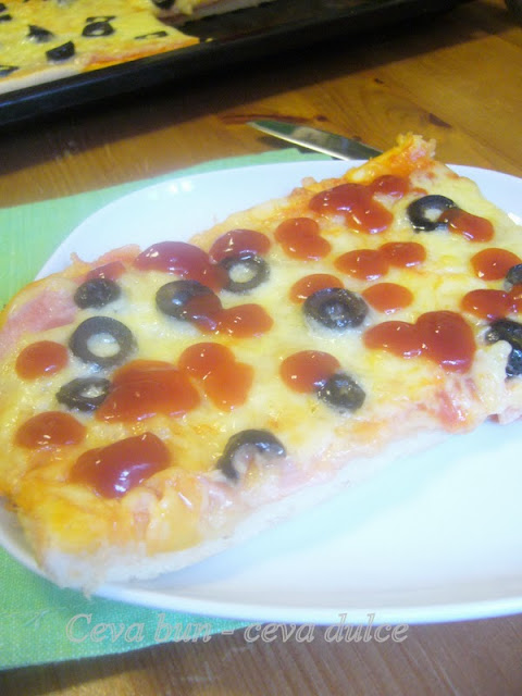 Deci sa incepem cu reteta de pizza by Adnia, dupa cum va spuneam este rapida si la indemana oricui, depinde doar de gustul si placerea fiecaruia. Eu am renuntat la cateva ingrediente, adica ciupercile si porumbul, ciupercile pentru ca nu prea le place la mofturoasele mele, iar porumbul pentru ca fetita mea cea mare are alergie la porumbul fiert.
