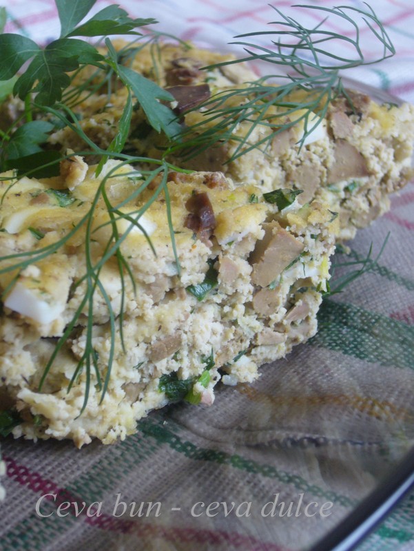 Se pun toate ingredientele intr-un bol, se condimenteaza cu sare si piper, apoi se bat ouale cu lapltele si se adauga la ingrediente. Adaugam la compozitie 2 linguri de ulei , iar cu o lingura ungem un vas termorezistent si presaram cu pesmet. Turnam compozitia in vas , nivelam si introducem in cuptorul incins pentru 30-40 min.
