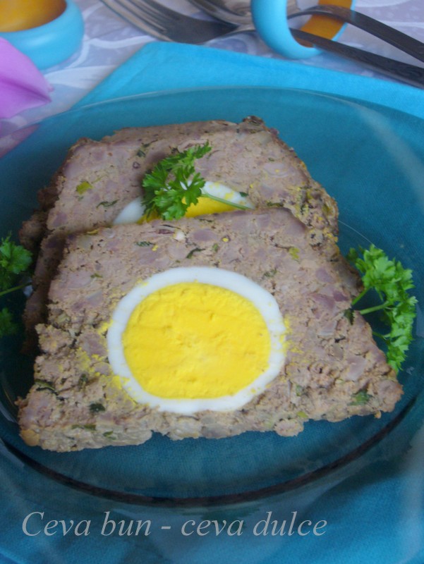 Apoi se dau prin masina de tocat se condimenteaza cu sare , piper si boia de ardei, adaugam ceapa verde taiata marunt, patrunjelul tocat si usturoiul pisat si amestecam. Spre final adaugam din apa care a fiert si ouale batute, se amesteca. Intr-o tava de chec, nu foarte mare, tapetata cu hartie de copt si uns cu ulei asezam 1/3 din carne, asezam ouale fierte si restul de compozitie. Introducem in cuptorul incins 30-40 min, dupa acea scoatem, racim si servim cu mare pofta!!